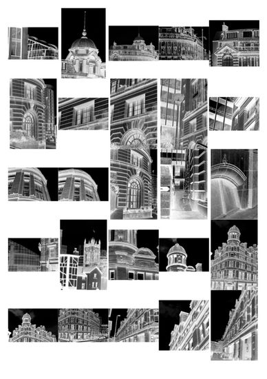 I then scanned and inverted my darkroom images to create positives. when this was done it made any imperfections in the paper and acetate more prominent. This give the images a more handmade and aged feel. This creates an interesting contrast when the more modern, glass buildings are printed with the older, traditional photography style.